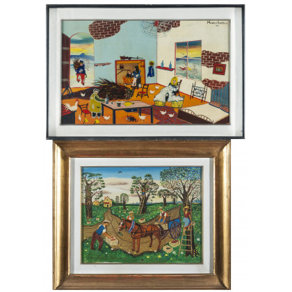 Panizza, Portella "Raccolta delle mele" e "Interno di casa" due dipinti di tecniche e misure diverse. In cornice (lievi difetti)