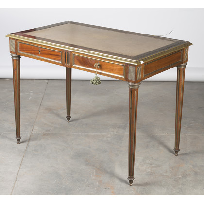 Scrittoio da centro in mogano a due cassetti con piano in pelle impresso in oro, filettato in ottone gambe scanalate e rastremate terminanti con piedi in ottone inizio del sec. XIX (cm 100x75x60)