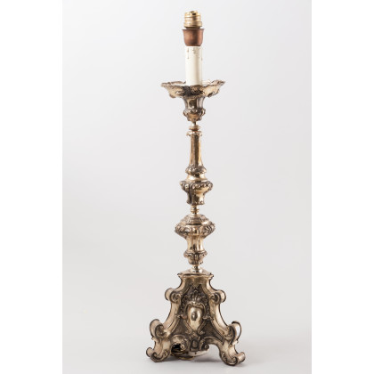 Candeliere in rame argentato e sbalzato a volute fogliate, sec. XVIII (h cm 50)(difetti)