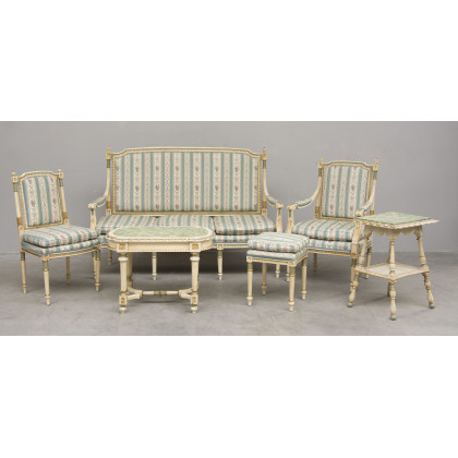 Fornitura da salotto in legno laccato e dorato composto da divano, poltrona, sedia, tavolo da salotto, un pouf ed un etagere (difetti)