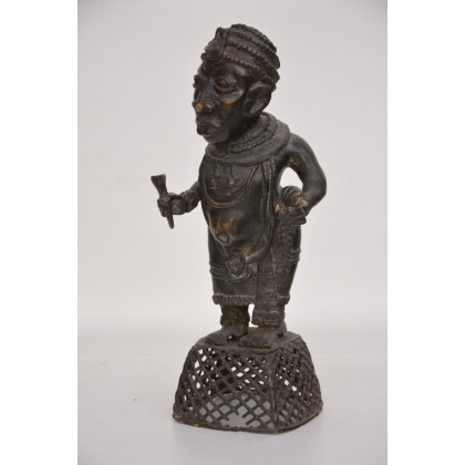 Arte africana. Antica scultura in bronzo raffigurante personaggio con strumenti rituali (h cm 48) (difetti)