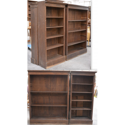Gruppo di cinque librerie in legno con vani a giorno, misure diverse (difetti e mancanze)