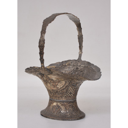 Cestino in rame argentato e sbalzato a volute, reticolati, festoni, uccelli e medaglioni contenenti putti giocosi. Manico sagomato. Punzoni alla base