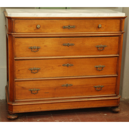 Comò a quattro cassetti con piano in marmo bianco di forma sagomata, piedi a cipola tornita. Sec XIX (cm 116x103x54)