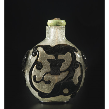 Manifatura cinese sec. XX. Snuff bottle in vetro incamiciato in nero a motivo di dragoni stilizzati. (H cm 7.5) (Difetti) * Lotto con Attestato di Libera Circolazione.