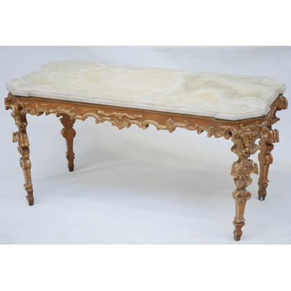 Tavolino basso da centro rettangolare con sostegni in legno scolpito e dorato e piano in onice (cm 102x50x50)