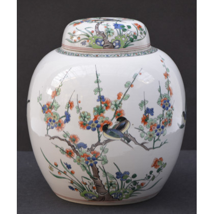 Manifattura di Cina inizio XX secolo. Potiche con coperchio in porcellana decorati a policromia a volatili policromi (h cm 30)