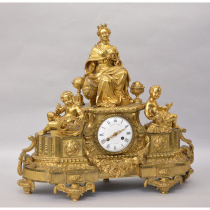 Pendola Francia, anni 1850-1870 circa, in bronzo dorato, raffigurante l'allegoria delle scienze esoteriche e le arti, sospensione a filo, movimento 7gg, suoneria delle ore e della mezza sul campanello, firmata sul quadrante