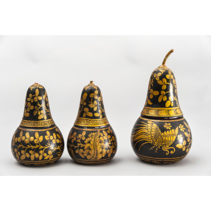 Manifattura orientale. Tre scatolette in legno a forma di pera laccate nere con motivi floreali dorati (difetti)