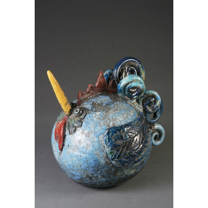 Manifattura del sec. XX Scultura in ceramica nei toni del blu Raku raffigurante un gallo (cm 25,5) (difetti e restauri) Manufacture of the 20th century. Ceramic blue Raku sculpture (defects and restorations)