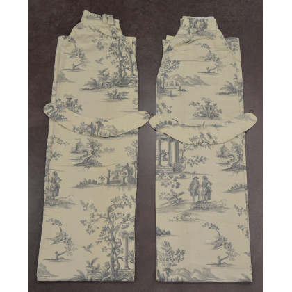 Lotto composto da due tende e due bracciali in cotone toile de jouy produzione francese, con scene di rovine in colore grigio. Sec. XX (cm 300x240) (difetti, macchie) Lot comprising two toile de Jouy curtains and two tiebacks, 20th century (defects and stains)