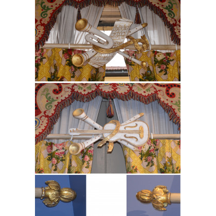 Due bonagrazie laccate di bianco e avorio e dorature con finale a forma di fiore aperto, al centro motivo decorativo con strumenti musicali, uno con viola e clarinetti, l'altro con tromba e un clarinetto, lunghezza cm 230. Two white and ivory lacquered borders