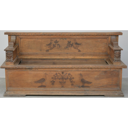 Antica panca con seduta apribile, schienale e parte frontale decorata con volatili e rami fioriti, braccioli terminanti con mascheroni (cm 165x47x80) (difetti)