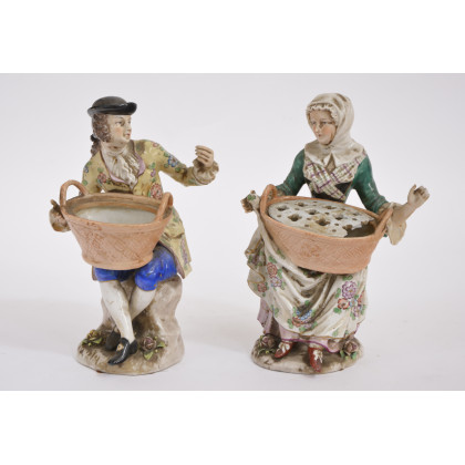 Manifattura italiana sec. XX 'Contadine con ceste' due statuette in porcellana policroma (h cm 20) (difetti e mancanze)