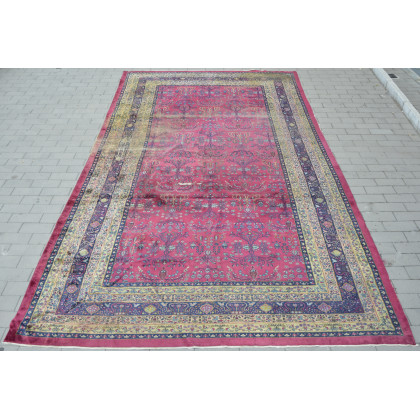 Grande tappeto Keshan di tipo americano, disegno floreale su fondo ciclamino (gravi difetti, rotture e mancanze)(cm 730x390)