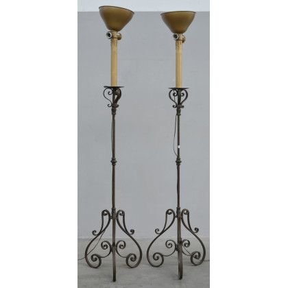 Coppia di torciere in ferro battuto, su base tripode a riccioli (h cm 139) montate a luce elettrica (h tot cm 192)