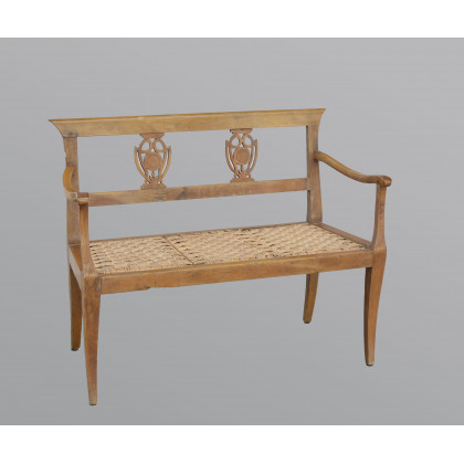 Divanetto in noce a due posti con gambe a sciabola, braccioli mossi e schienale a giorno decorato con scudi, seduta incannucciata. XIX secolo (cm 110x87x48) (difetti)
