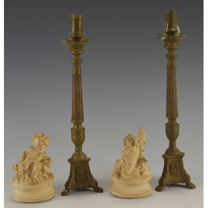 Lotto composto da una coppia di candelieri in metallo del sec. XIX e due sculture in terracotta raffiguranti putti