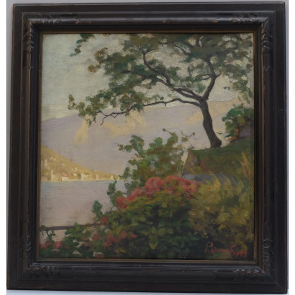 Firma indecifrata 'Scorcio lacustre' olio su cartone pressato (cm 50x45) firmato in basso a destra In cornice