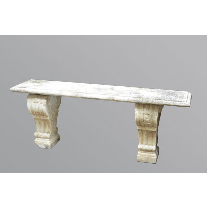 Panca da esterno in marmo bianco con montanti scolpiti a volute e piedi a ricciolo(cm 150x50x36)