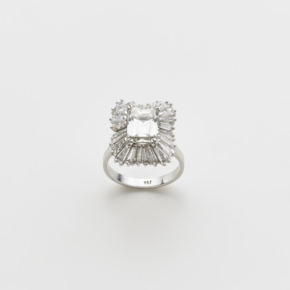 Anello in oro bianco con diamanti tapered a contornare un diamante rettangolare ad angoli tronchi taglio a gradini di ct 3,19 g. 6,60 misura 16/56 Accompagnato da analisi gemmologica CISGMe n. 1857IAA Milano 14/10/2015 White gold ring with diamonds. Appended CISGEM gemmological report