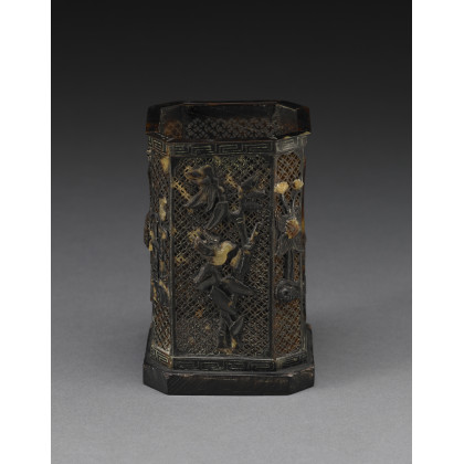 Portapennelli in tartaruga intagliato e traforato, di forma rettangolare con angoli lobati, decorato con fiori, base in legno, Cina, sec. XX A carved and pierced tortoiseshell brushpot of rectangular form with canted corners, decorated with flowers, wood base China, 20th century (h cm 11)