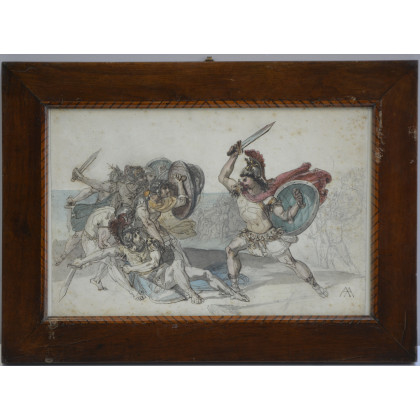 Scuola lombarda del XIX secolo "Studio per scena di battaglia" tecnica mista su carta (cm 24.5x36) In cornice