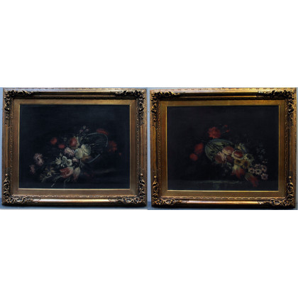 Scuola lombarda del secolo XVIII, coppia di composizioni con fiori, oli su tela (cm 45x60) In cornici (difetti e restauri)