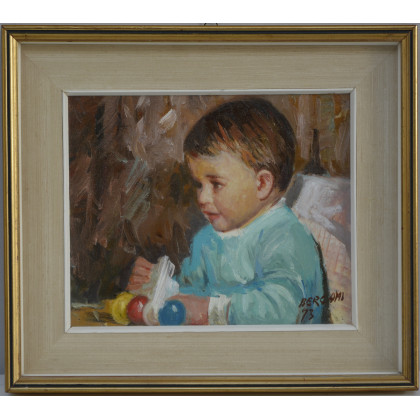 "Bimbo con sonaglino"olio su compensato (cm 25x30) Firmato e datato '73 in basso a destra. In cornice