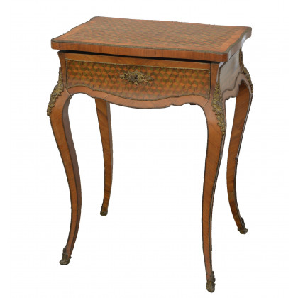 Mobile toilette di forma mossa lastronato in noce ed intarsiato a motivi geometrici. Piano ribaltabile con specchio interno e cassetto sottopiano guarnizioni in bronzo. Sec. XIX (cm 54x76x38)(lievi difetti)