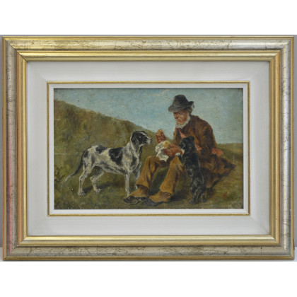 Ignoto "Vecchio con cane". Olio su masonite. Siglato in basso a destra. In cornice (cm 22,5x34,5)