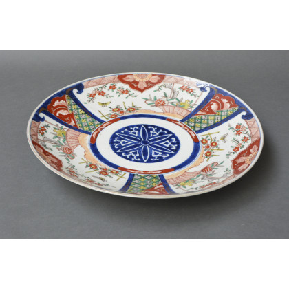 Piatto in porcellana Imari decorato con fiori e farfalle nel cavetto Giappone, sec. XX (d cm 37,5)
