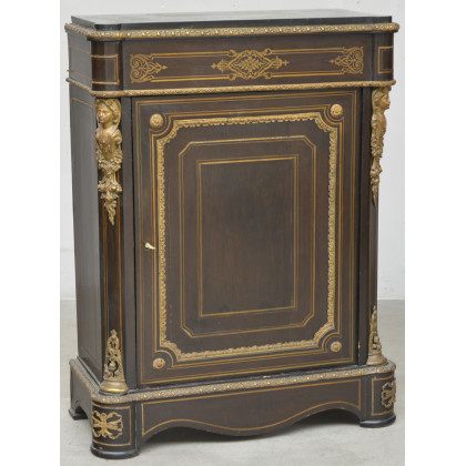 Credenza in legno ebanizzato ed intarsiato a volute in ottone. Fronte ad un' anta con montanti decorati a fregi in bronzo cesellato a volute e lesene figurate; piano in marmo. Fine XIX secolo (cm 84x110x38) (difetti)