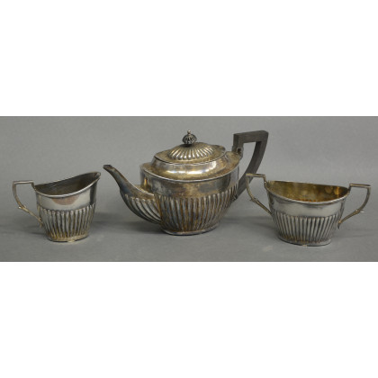 Servizio in metallo argentato composto da teiera, zuccheriera e lattiera (lievi difetti)