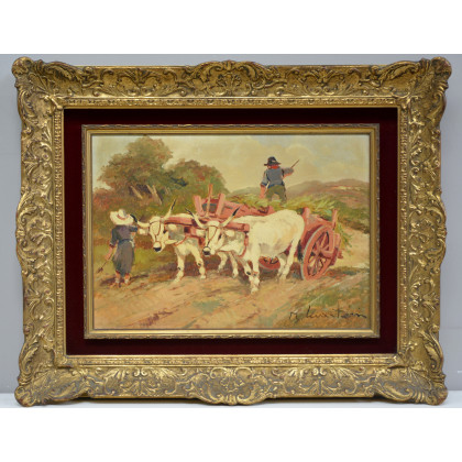 Firma indecifrata. "La raccolta del fieno", olio su masonite (cm 35x50) Firmato in basso a sinistra. In cornice