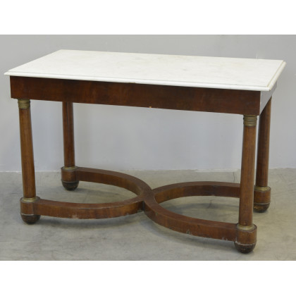 Tavolo consollles in noce. Quattro gambe tornite con capitelli in bronzo dorato unite da traversa a lira. Piano in marmo, sec. XIX (cm 120x76x59) (lievi difetti)
