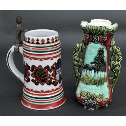 Lotto composto da un boccale in porcellana di manifattura tedesca e da un vasetto biansato in ceramica (difetti)