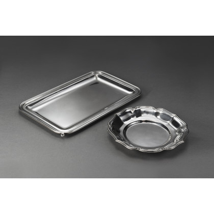 Lotto composto da uno svuota tasche ed un piattino con bordo mistillineo in argento (gr 370)(difetti e mancanze)