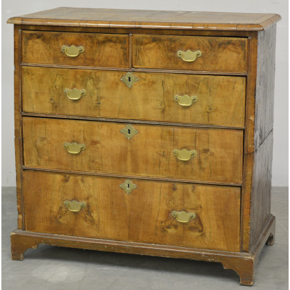 Comò a tre cassetti grandi e due piccoli sottopiano. Fronte e piano filettati in radica (cm 97x97x54)(difetti e restauri)