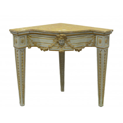 Antica consolle ad angolo in legno laccato verde e dorato, piano in marmo di forma sagomata, la fascia centrata da testa di putto con ghirlanda di fiori, gambe ad obelisco rovesciato (cm 69x89x110) (difetti)