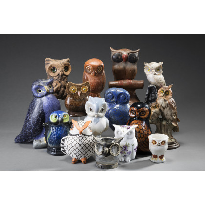 Gruppo di quindici statuette raffiguranti gufi in materiali diversi Lot comprising fifteen owl statuettes in different materials