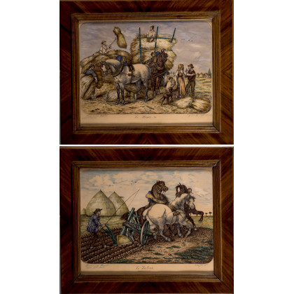 "La moisson" e "Le labour" coppia di acquetinte (45x55) In cornice lastronata in noce "La Moisson" and "Le Labour" pair of acquatints. Veneered frame