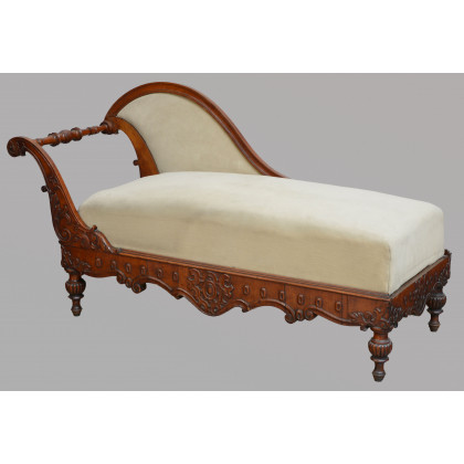 Dormeuse con fascia e bracciolo mossi e intagliati a volute fogliate. Gambe e traversa tornita. Sec. XIX (difetti)