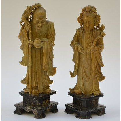 Arte orientale "Dignitari" coppia di sculture in pietra saponaria (h cm 31) (difetti)