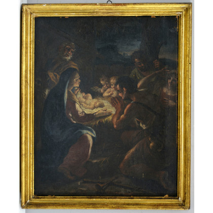 Scuola del sec. XVIII "Nascita di Gesù" olio su tela (cm 50x40) in cornice dorata