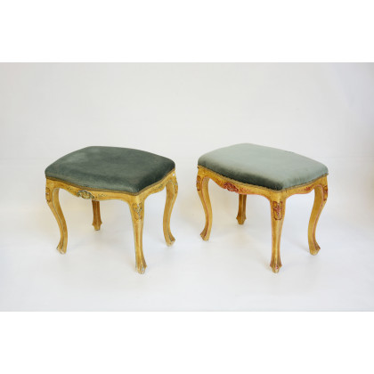 Coppia di sgabelli in legno laccato decorato in policromia a fiori. Gambe mosse