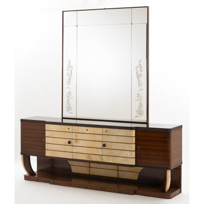 Credenza con grande specchiera di gusto déco lastronata in legno di palissandro indiano liscio e grissinato. Fronte ad ante e cassetti parzialmente rivestiti in pergamena, quattro gambe inflesse. Italia, anni 30 (cm 261x101x53 - specchio 155x176) (lievi difetti)