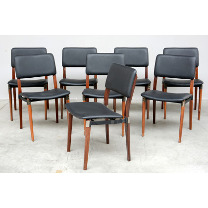 Otto sedie modello "S82". Produzione Tecno, Varedo, 1963. Massello di palissandro, fusione di alluminio e pelle nera (cm 44x80x53) (difetti)