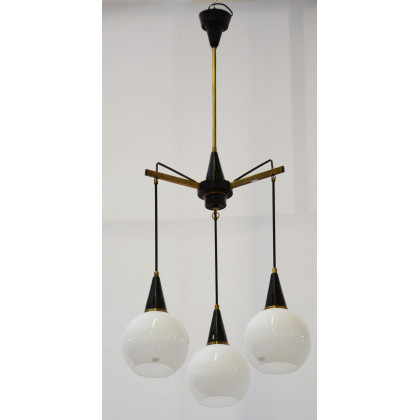 Lampadario a tre luci in ottone e metallo laccato nero con diffusori a globo in vetro incamiciato lattimo. Produzione italiana, anni '60 (h cm 97)