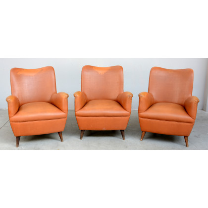 Lotto di tre poltrone rivestite in skai marrone, cuciture borchiate e piedini in legno troncoconici. Italia anni '50/'60 (cm 70x84x70) (difetti)
